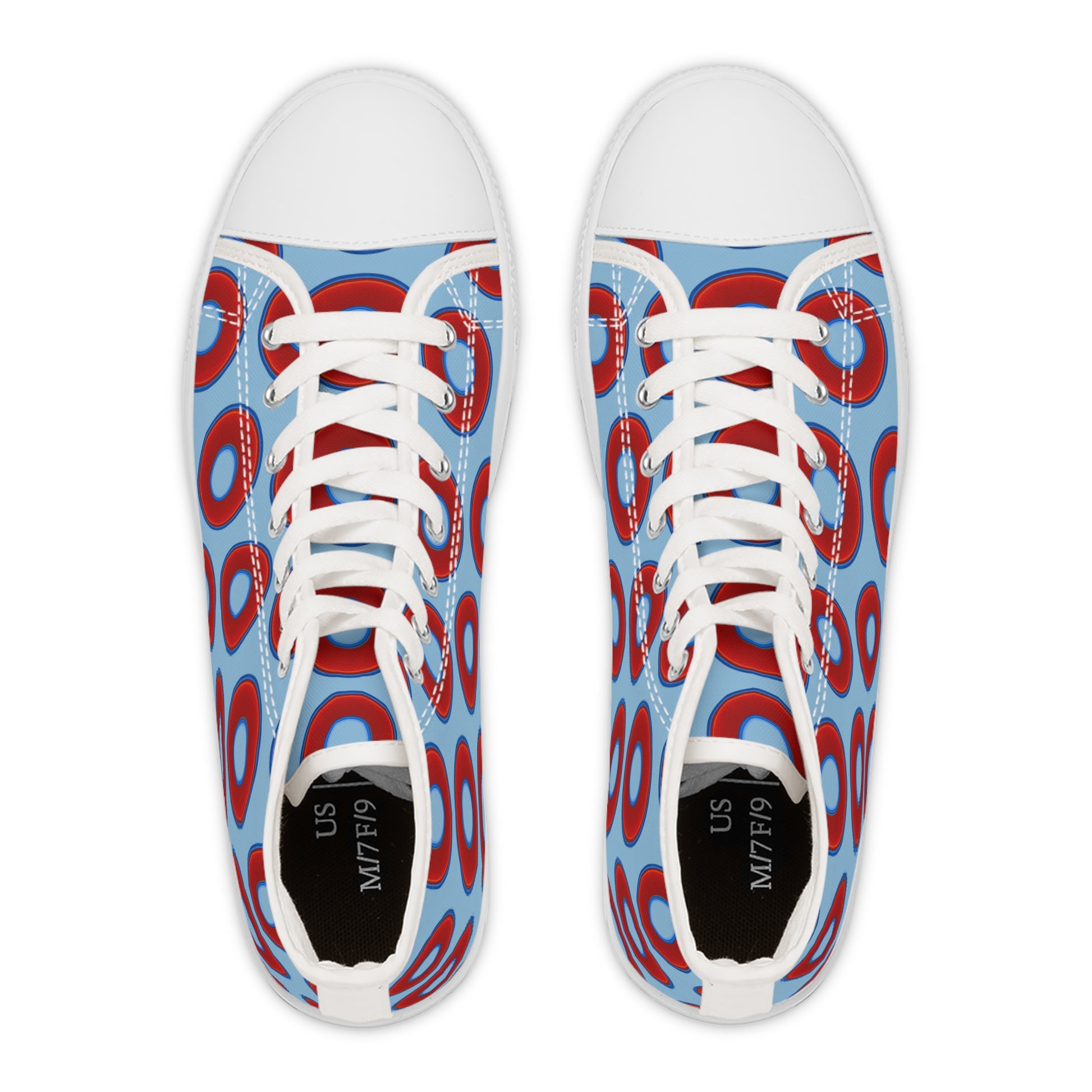 Women's High Top Chuck Taylors - large vivid red donut print w/light blue background