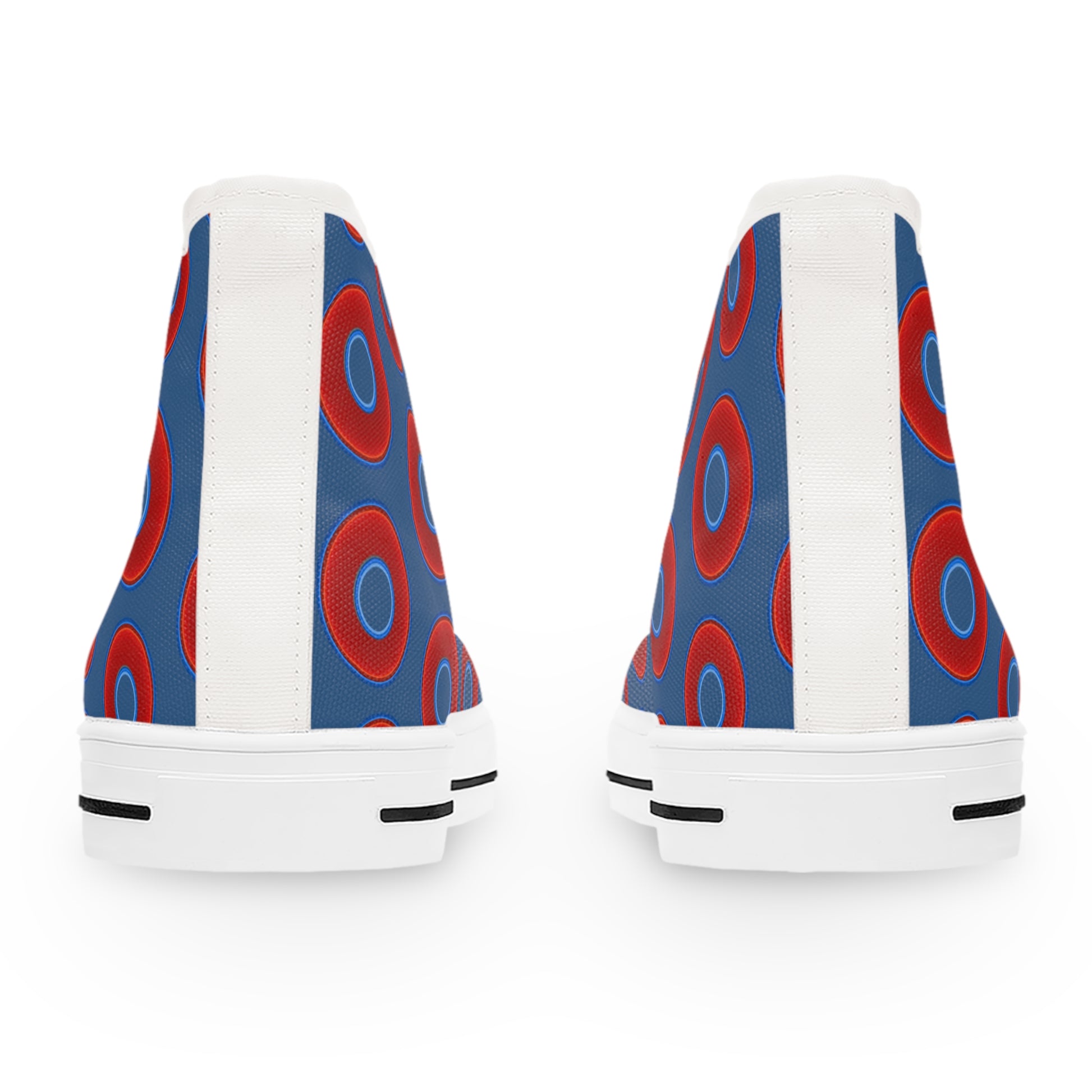 Women's High Top Chuck Taylors - large vivid red donut print w/light navy blue background
