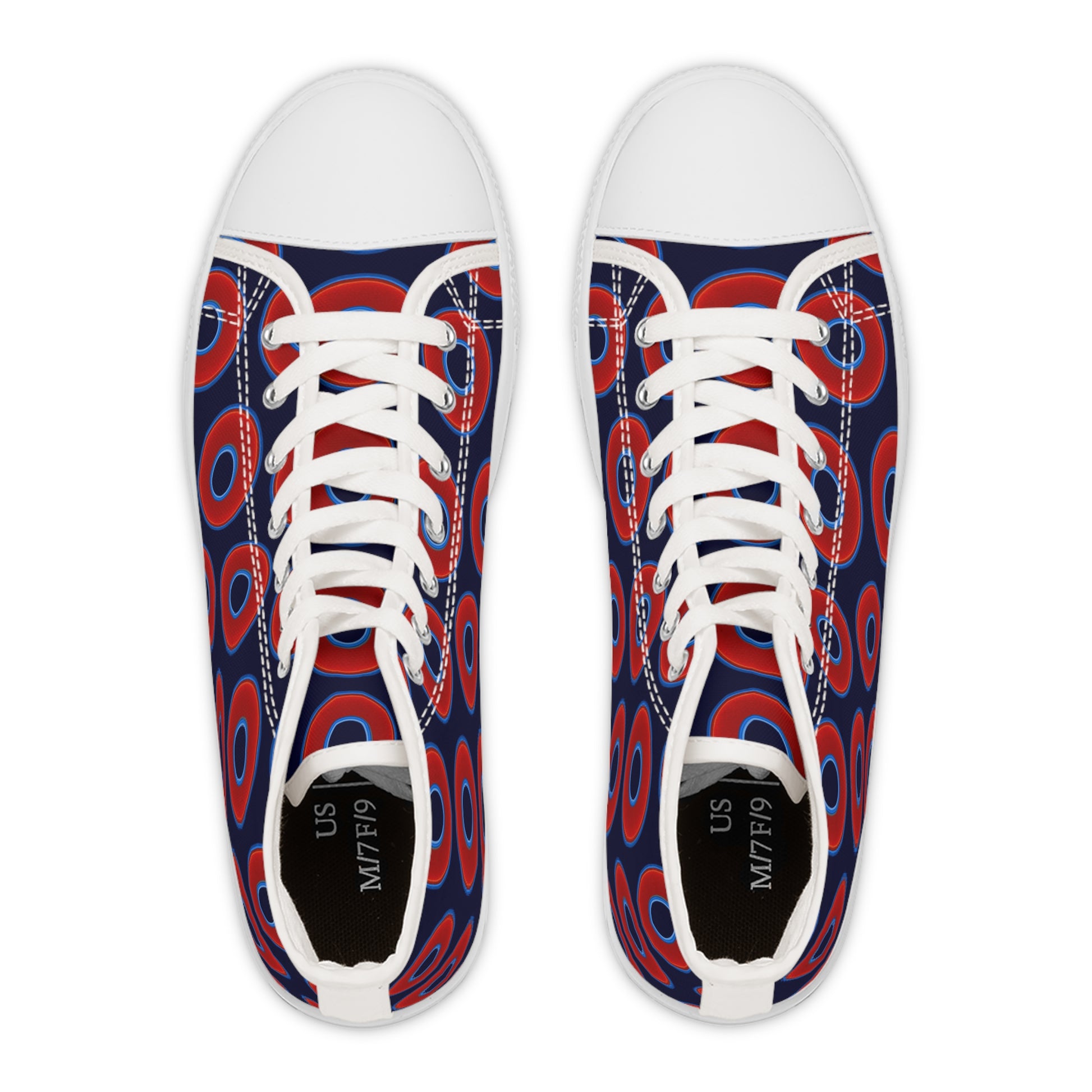 Women's High Top Chuck Taylors - large vivid red donut print w/midnight blue background