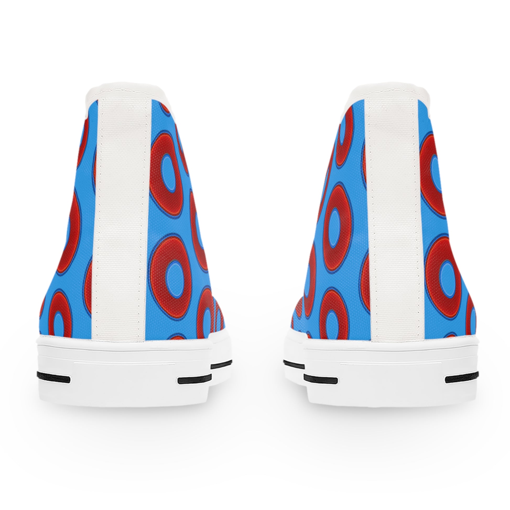 Women's High Top Chuck Taylors - large vivid red donut print w/sky royal blue background