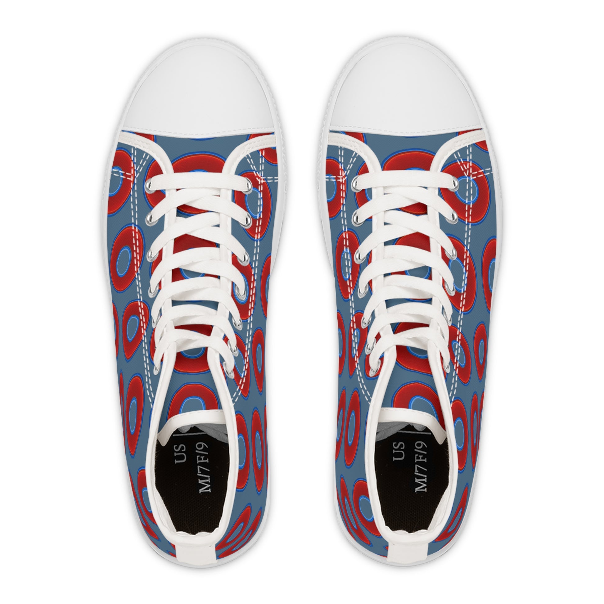 Women's High Top Chuck Taylors - large vivid red donut print w/steel blue background