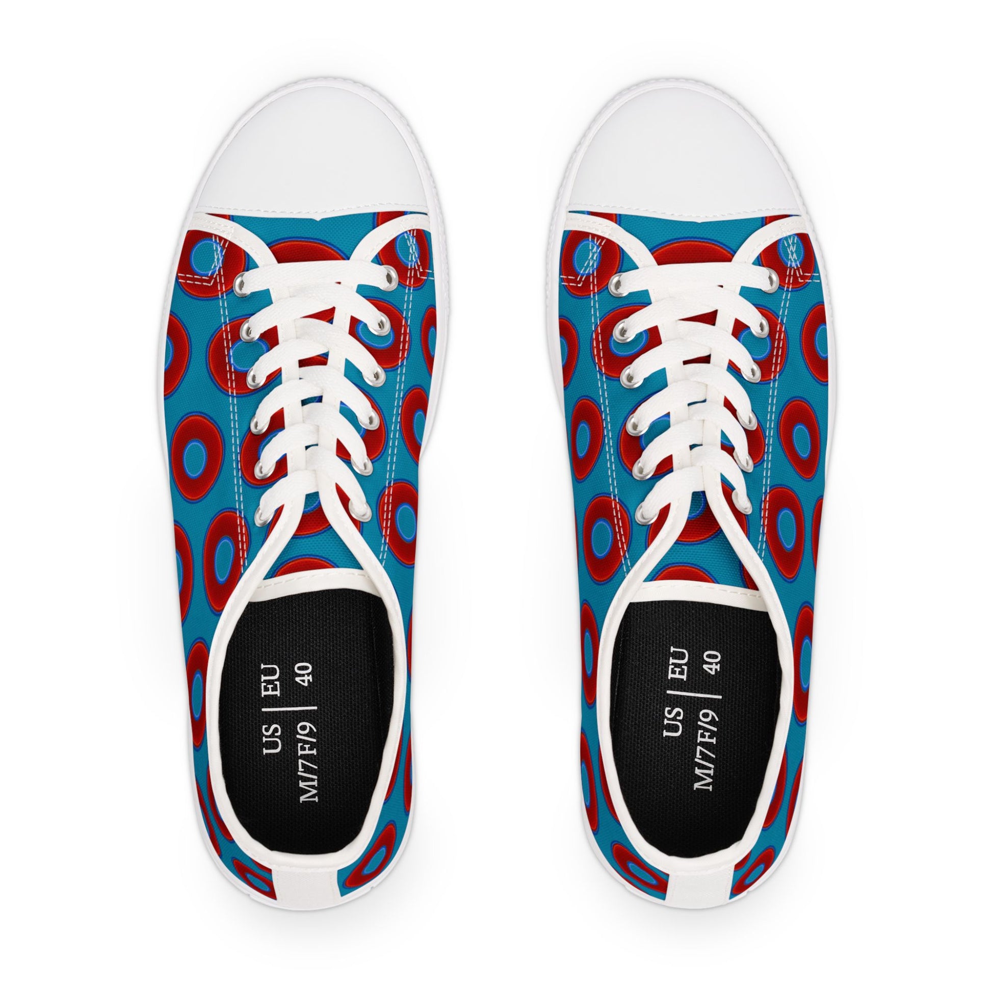 Women's - Low Top Chuck Taylors - large vivid red donut print w/aquamarine blue background