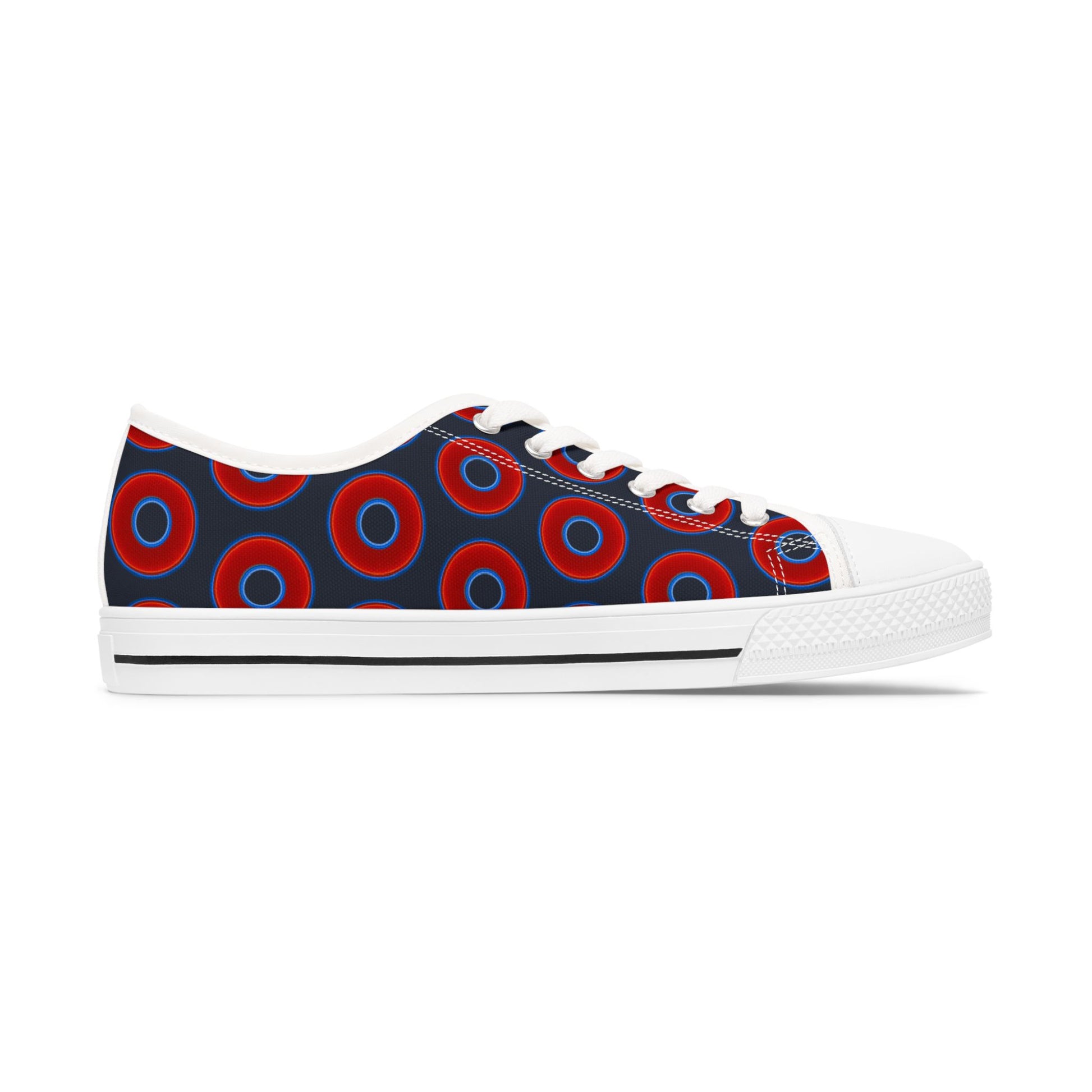 Women's - Low Top Chuck Taylors - large vivid red donut print w/dark teal elite background