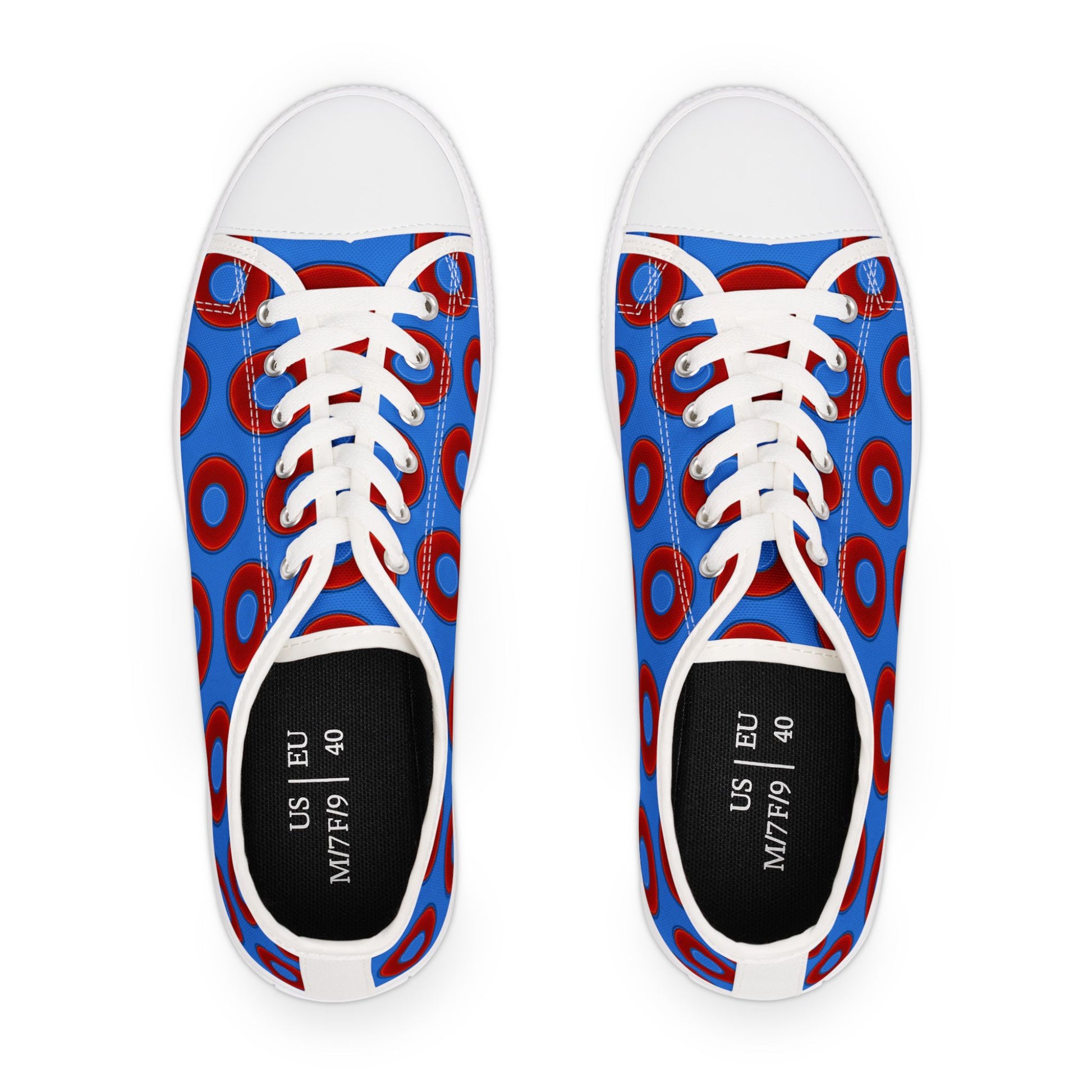 Women's - Low Top Chuck Taylors - large vivid red donut print w/light royal blue background