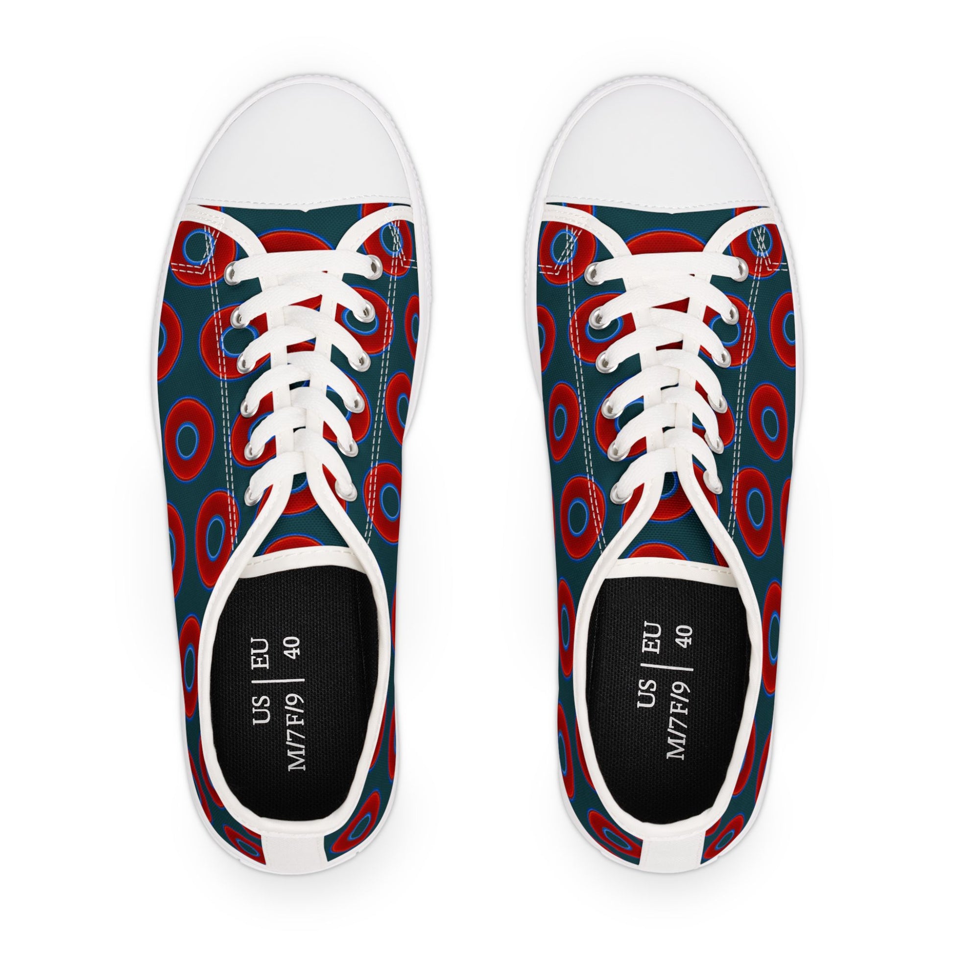 Women's - Low Top Chuck Taylors - large vivid red donut print w/midnight teal green background