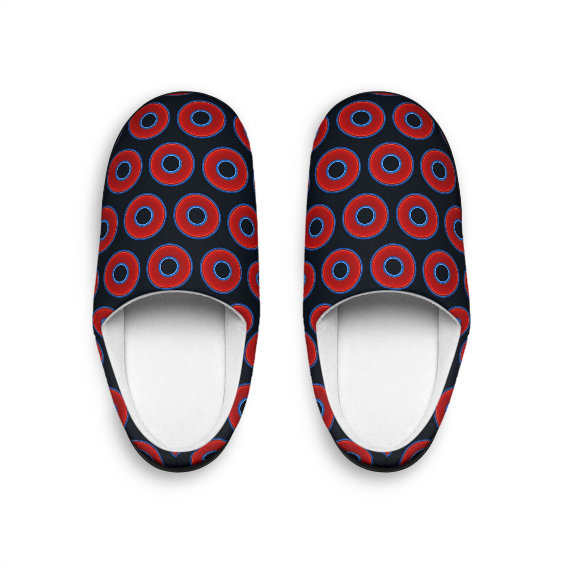 Women's Lumpy Slippers - red vivid donut print w/blue charcoal background
