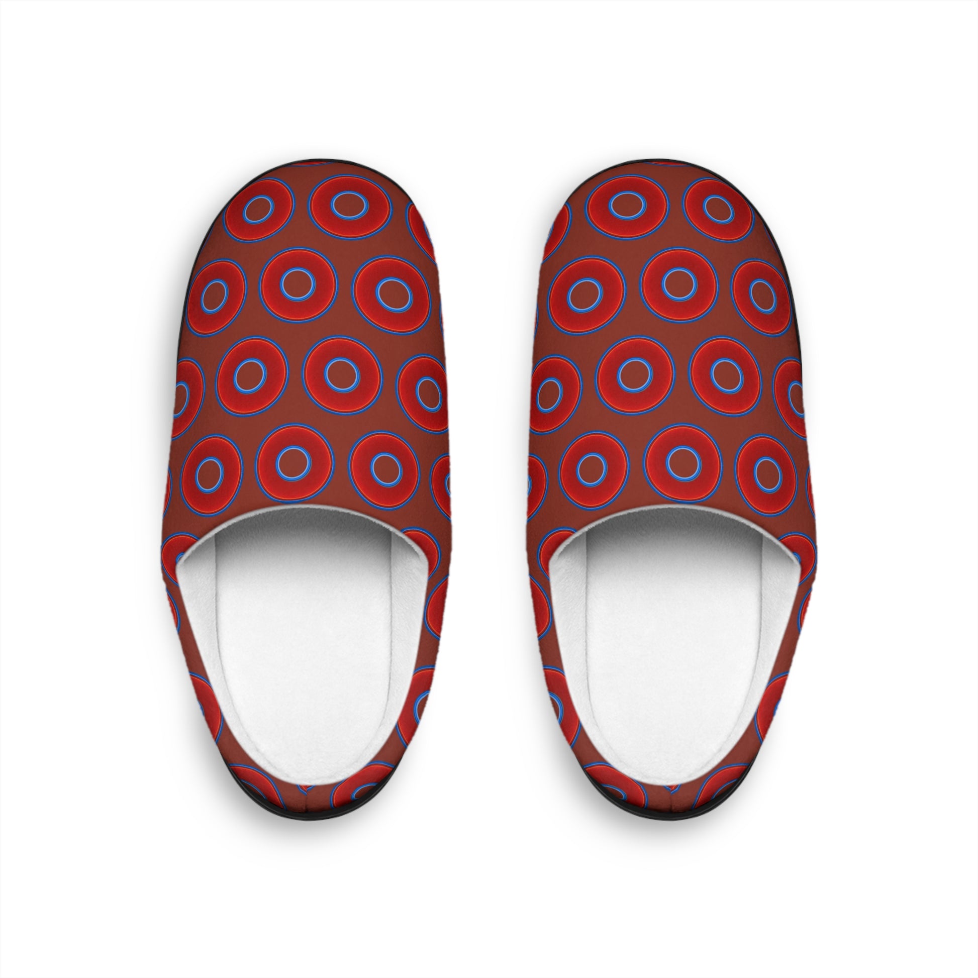 Women's Lumpy Slippers - red vivid donut print w/burnt umber background