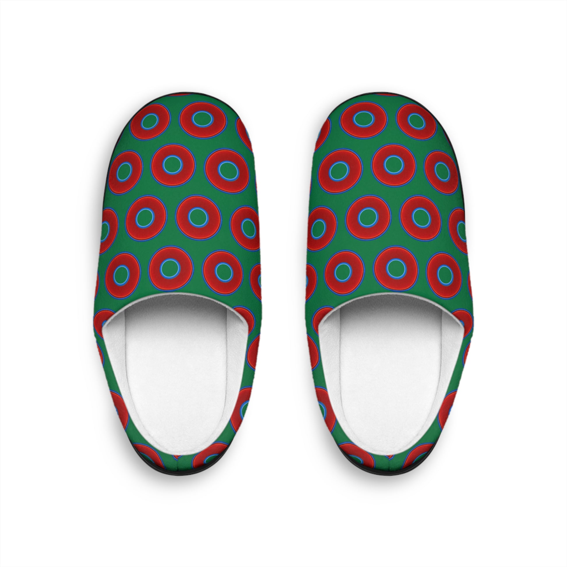 Women's Lumpy Slippers - red vivid donut print w/green background