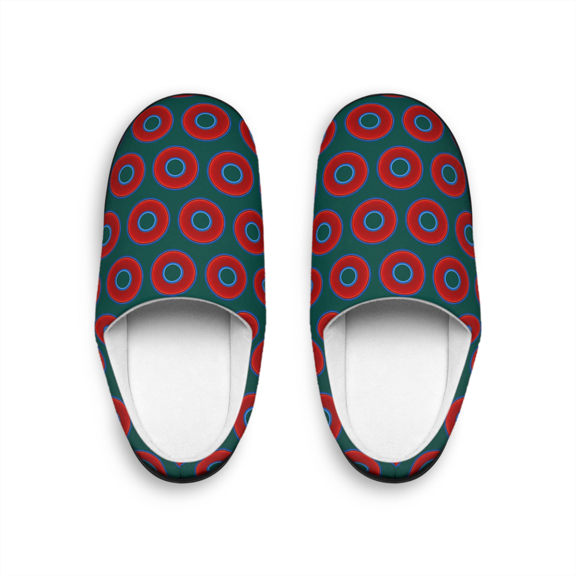 Women's Lumpy Slippers - red vivid donut print w/dark Fenway green background