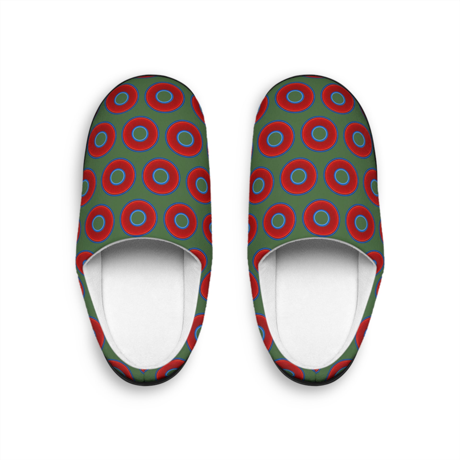 Women's Lumpy Slippers - red vivid donut print w/dark green background