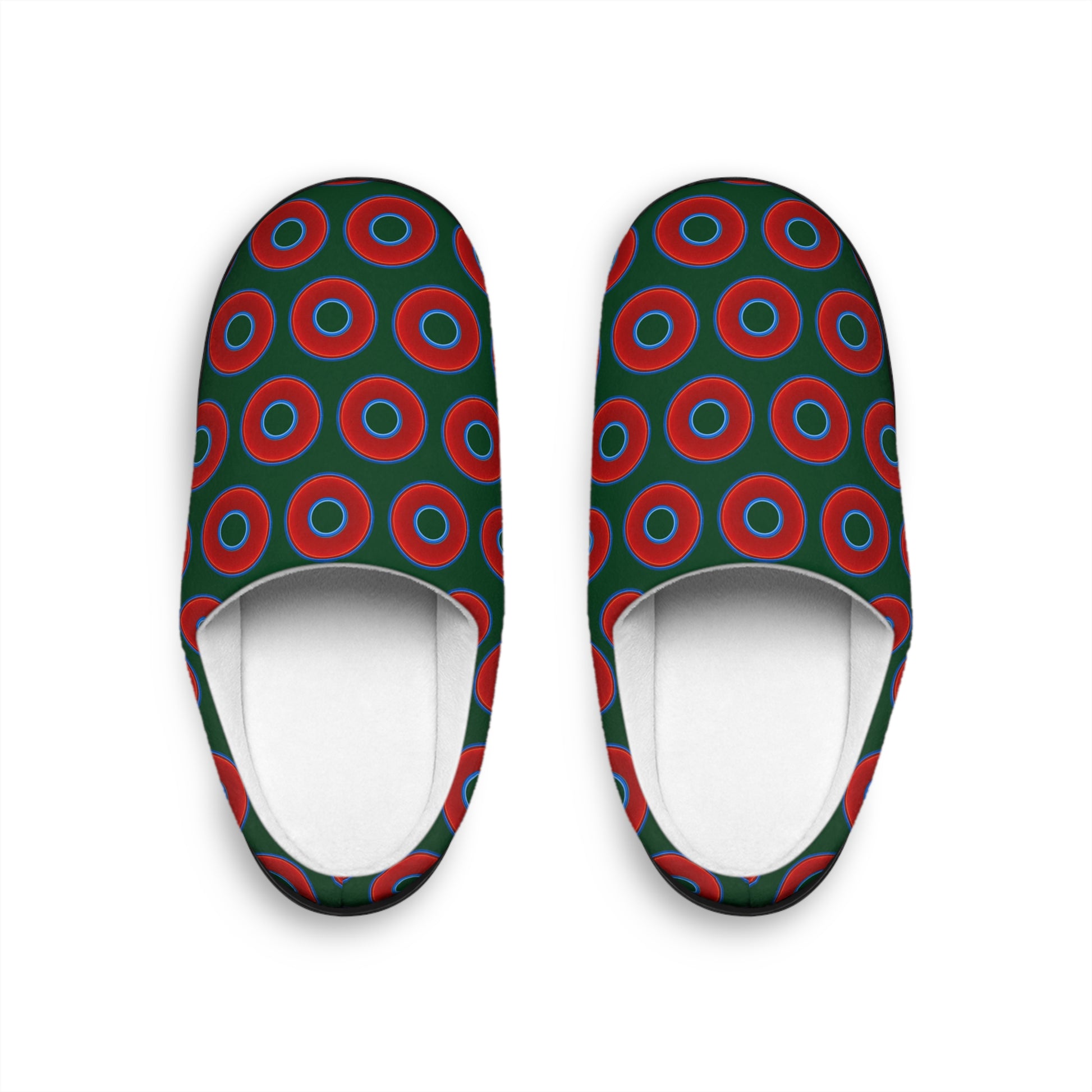 Women's Lumpy Slippers - red vivid donut print w/deep pond green background