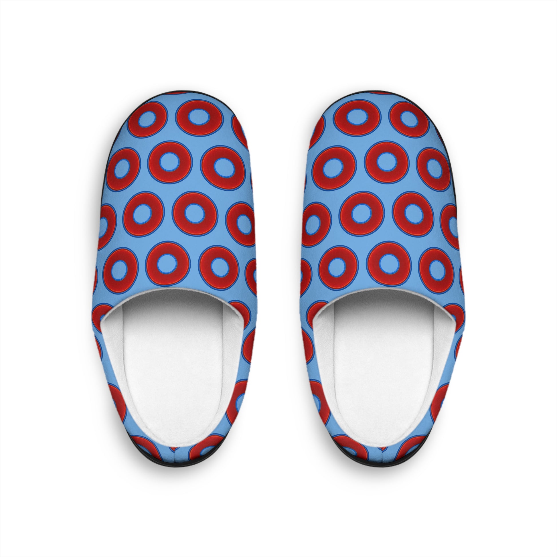 Women's Lumpy Slippers - red vivid donut print w/light blue background