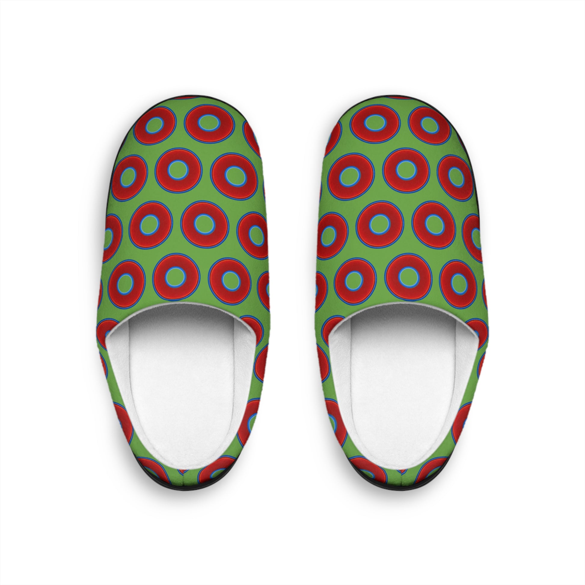 Women's Lumpy Slippers - red vivid donut print w/light green background