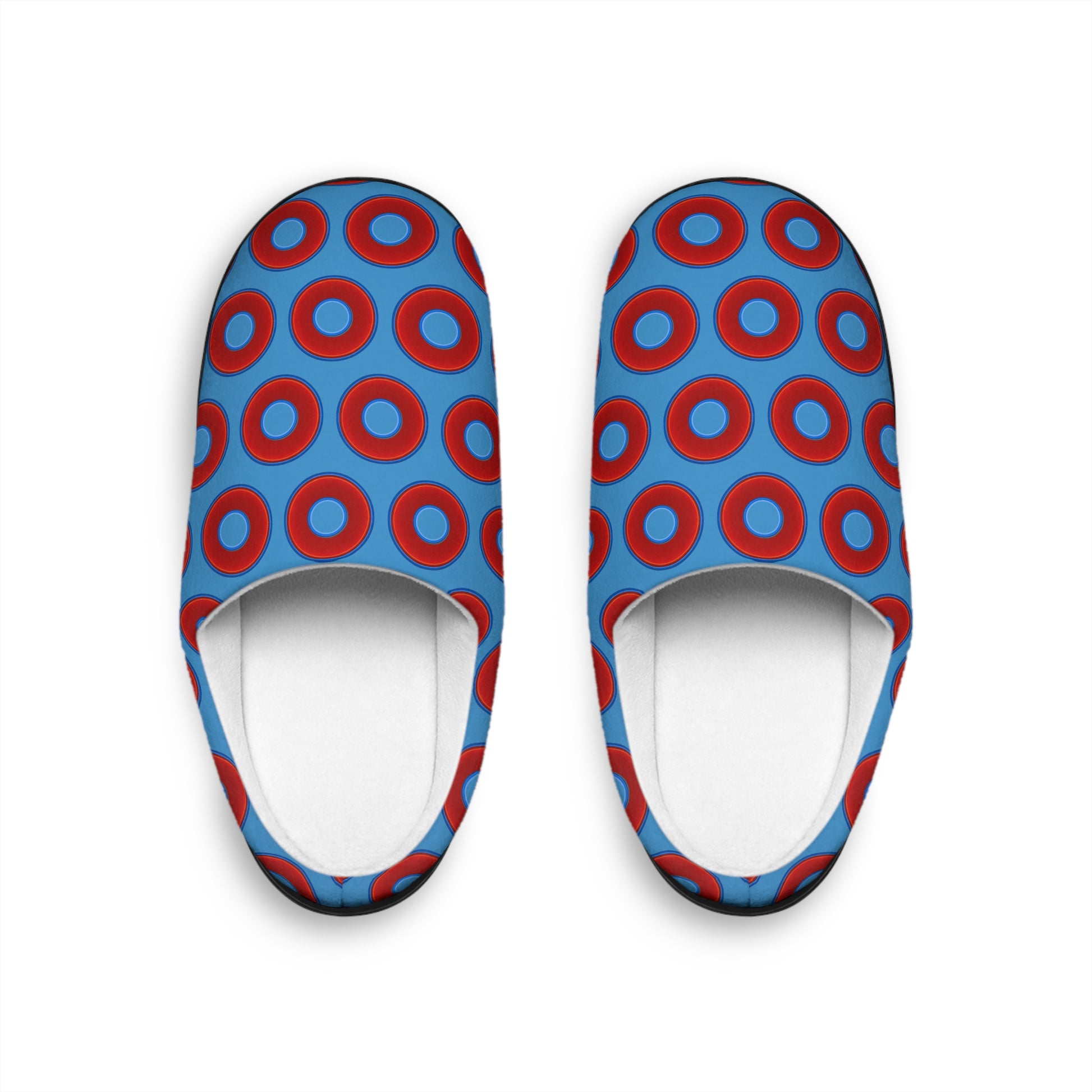 Women's Lumpy Slippers - red vivid donut print w/light steel blue background