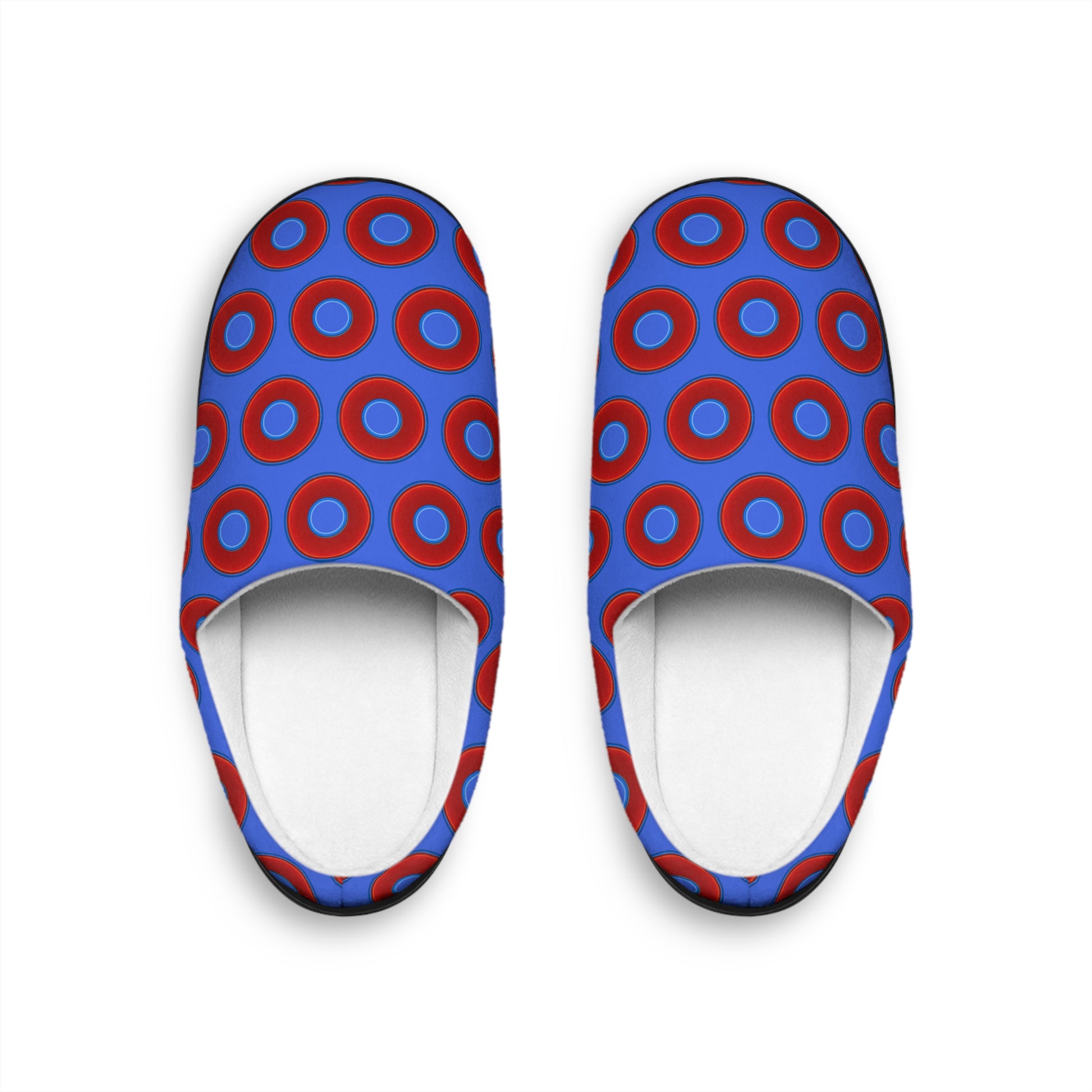 Women's Lumpy Slippers - red vivid donut print w/royal blue background